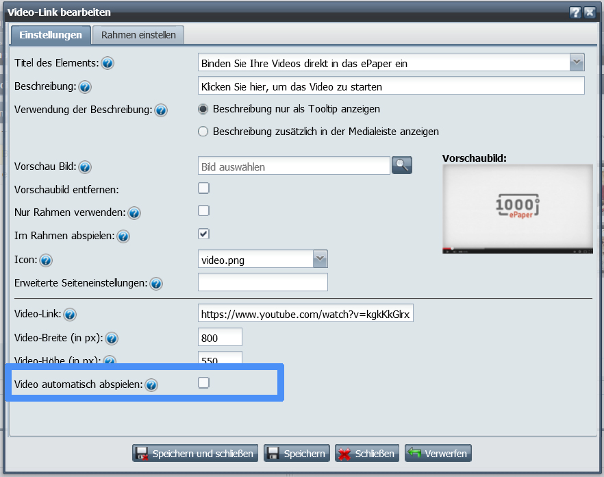 Und noch etwas kam bei dem CMS-Update dazu: Sie können eingebundene Videos in Ihrem ePaper automatisch abspielen lassen, wenn Sie ein Häkchen unter „Video automatisch abspielen“ in den Einstellungen zur Video-Einbindung setzen.