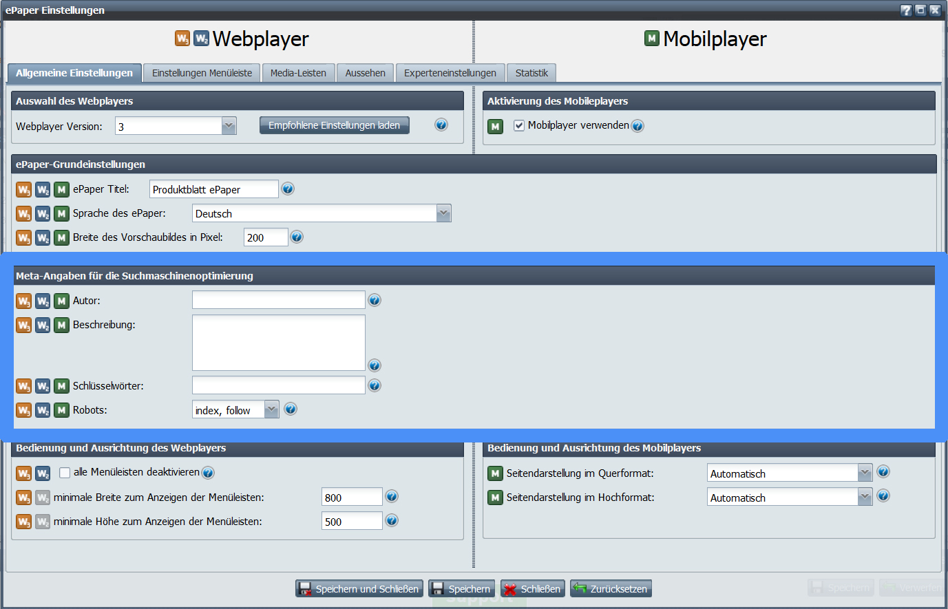 Die ePaper SEO Einstellungen ermöglichen das Hinzufügen einer Meta-Description und Keywords zum jeweiligen ePaper