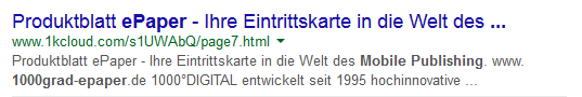Seit dem CMS-Update 1.31 werden die von Ihnen gesetzten Seitentitel nun auch als Meta-Title-Tag der jeweiligen Seite gesetzt. Google und andere Suchmaschinen nutzen diese Tags, um auf den Suchergebnisseiten Seitentitel zu erzeugen (siehe Screenshot). Wenn ein Suchergebnis das Suchwort (auch Keyword genannt) bereits im Titel enthält, geht Google davon aus, dass die Seite für den Leser relevant ist. Als Folge erscheinen Ihre ePaper auf den vorderen Plätzen der Suchergebnisse. Damit werden Ihre ePaper zum wichtigen SEO-Faktor beim Onlinemarketing.