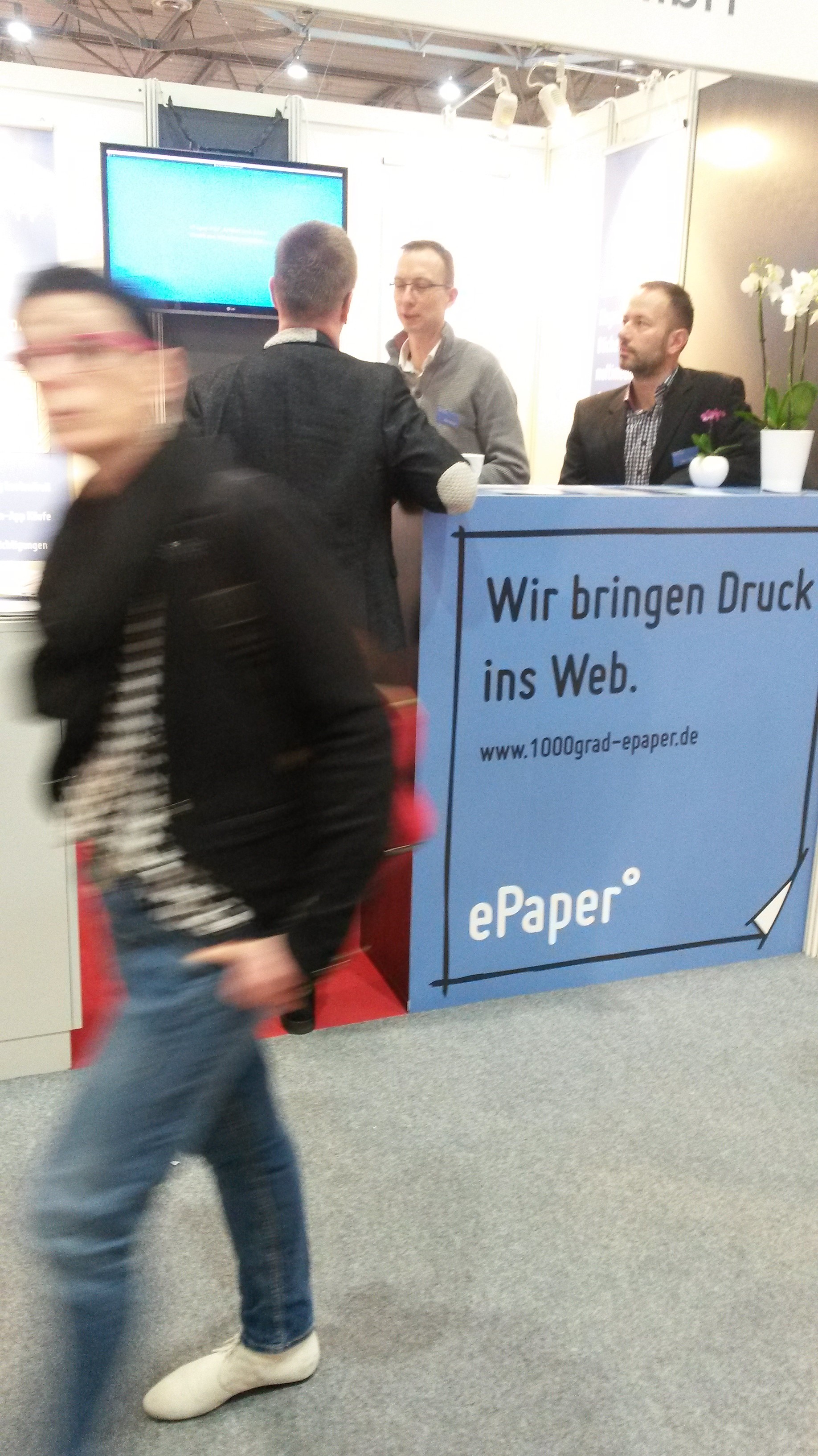 Gut aufgehoben war der 1000°ePaper Stand gegenüber der Blogger-Lounge und inmitten der Zeitungs- und Zeitschriftenverlage, Software-Anbieter und Self-Publishing Dienste in Halle 5. Viele Interessenten kamen am Donnerstag an unserem Messestand vorbei und wir konnten unsere Lösungen, Referenzen und Demo-Vorführungen vorstellen.