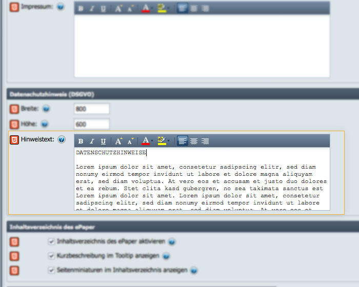 - verwenden Sie den Datenschutzbereich im ePaper CMS